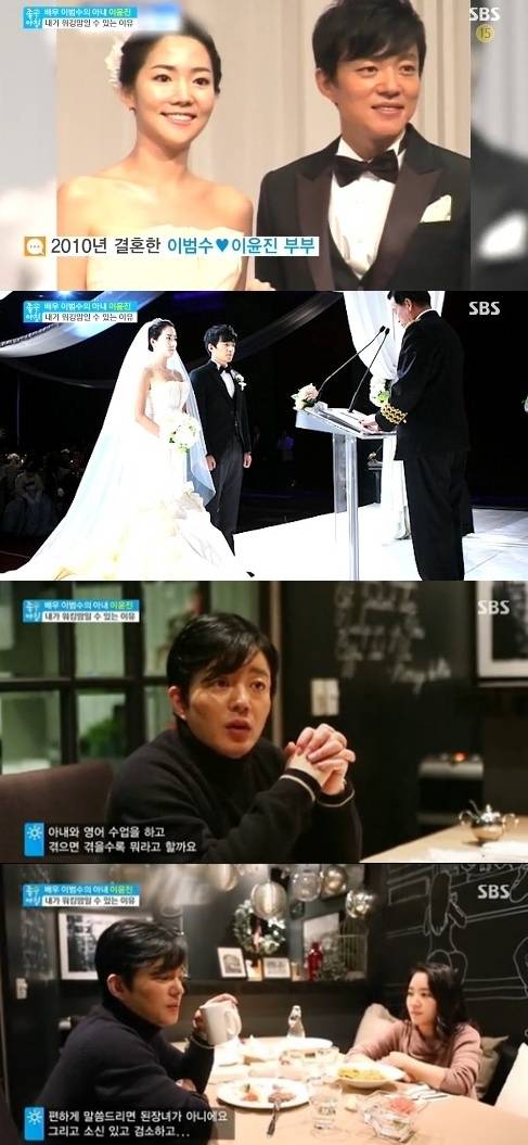배우 이범수가 아내 이윤지에 대한 깊은 애정을 과시했다.16일 오전 방송된 SBS '좋은 아침'에서는 이범수 이윤진 부부가 출연해 14살 나이차를 극복하고 결혼에 골인하기까지의 러브스토리를 공개했다.이날 이윤진은 이범수와 영어과외 교사와 학생으로 처음 만났던 당시를 떠올리며 "우리가 결혼하게 될 거라고 생각을 못했다. 진짜 사담도 안 나누고 공부만 했다"고 털어놨다.이어 "사적인 이야기를 주고받지 않았다. 이범수 씨가 역사 이야기를 좋아했다. '재밌죠?'라고 계속 이야기하는데 머릿속으론 딴 생각을 하면서 들었다. 그래서 더 어려운 학생이었다"고 말했다.아내 이윤진의 말에 이범수는 "나는 역사 이야기를 좋아한다. 근데 우리 집사람은 역사를 끔찍이 싫어한다"고 밝혀 웃음을 자아냈다.또, 이범수는 "아내와 영어수업을 하면서 겪으면 겪을수록 된장녀가 아니다. 소신 있고 검소하고 멋진 사람이다"며 "우리 아내가 최고였다"고 자랑했다.[이범수 아내 이윤진, 사진=SBS '좋은아침' 방송 캡처]