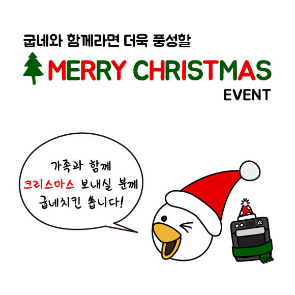 오븐구이 치킨전문 굽네치킨이 25일 크리스마스를 맞아 오는 18일까지 굽네치킨 공식 SNS에서 '메리 크리스마스' 이벤트를 펼친다.이번 이벤트는 고객이 굽네치킨 공식 페이스북이나 블로그에서 해당 이벤트 게시물에 크리스마스 계획을 댓글로 달아 응모되는 것으로, 추첨을 통해 굽네치킨 상품권을 전달한다.또한 오는 22일에는 굽네치킨 페이스북과 블로그를 통해 크리스마스 관련 게릴라 이벤트를 펼쳐 고객과 소통할 예정이다.㈜지앤푸드 마케팅팀 이병진 팀장은 "오는 크리스마스를 기념하기 위해 굽네치킨 SNS에서 고객들이 참여할 수 있는 이벤트를 기획했다"며 "앞으로도 다양한 이벤트를 진행해 고객들이 굽네치킨과 따뜻한 연말을 보낼 수 있도록 할 것"이라고 말했다.