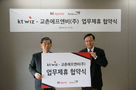 촌치킨이 kt wiz와 업무 제휴 협약을 맺고 본격 야구 마케팅에 나선다.교촌에프앤비㈜는 17일 kt sports 대회의실에서 kt wiz와 마케팅 업무 제휴 협약식을 진행했다고 밝혔다.교촌에프앤비는 kt wiz와 처음으로 야구 마케팅을 시도하는 치킨 프랜차이즈 기업으로 내년 시즌부터 kt wiz를 통한 야구 마케팅을 진행한다. 교촌에프앤비는 kt wiz 유니폼을 통해 광고를 노출하고, kt wiz의 홈 경기에 교촌에프앤비의 아이템을 이용한 다양한 이벤트로 수원 케이티 위즈 파크를 찾는 야구 팬들에게 더 큰 즐거움을 전달할 계획이다.교촌에프앤비 이근갑 국내사업부문 대표는 "kt wiz 야구단을 통해 야구를 사랑하는 많은 사람들과 함께하는 기회를 만들어 기쁘다"는 뜻을 밝혔고, kt sports 김영수 사장은 "교촌에프앤비와 수원 케이티 위즈 파크를 찾는 분들에게 즐거운 내년 시즌을 만들기 위해 노력하겠다"고 답했다.