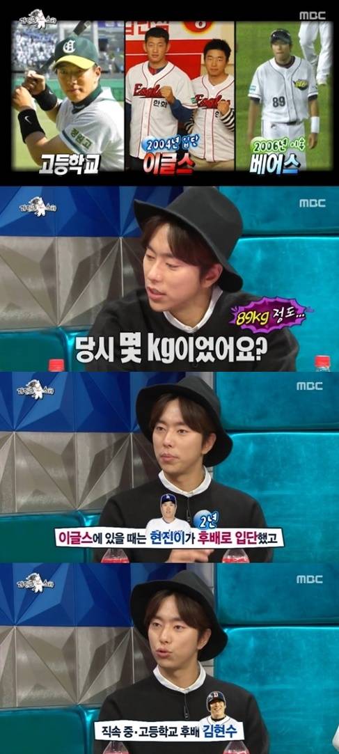 배우 윤현민이 과거 야구선수였음을 고백했다.지난 17일 방송된 MBC '황금어장-라디오스타'는 '내 허벅지는 돌벅지' 특집으로 펜싱 국가대표 출신 잭슨, 육상선수 출신 가수 바다, 프로야구선수 출신 배우 윤현민, 축구선수 출신 B1A4 바로가 출연했다.이날 '라디오스타' MC들은 윤현민이 과거 프로야구선수 출신임을 언급하며 두산 베어스와 한화 이글스 선수로 활약했던 당시의 사진을 공개했다.윤현민은 "5년 전까지 한화이글스 두산베어스 중견수였다. 주로 2군에 있었다. 주전은 이종욱 제이 데이비스였다"며 "당시엔 덩치가 있었다. 몸무게가 89kg였다"고 밝혔다.이어 "한화에 있을 때는 후배로 류현진이 들어왔고, 두산에서는 직속 중고등학교 후배인 김현수가 들어왔다"고 덧붙였다.[윤현민 과거 야구선수, 사진=MBC '라디오스타' 방송 캡처]