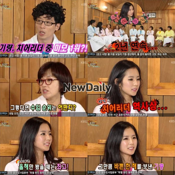 치어리더 박기량이 수입을 고백했다.지난 18일 방송된 KBS 2TV '해피투게더3'에는 '내가 최고' 특집으로 꾸며지며 각자의 분야에서 최고의 인기를 얻고 있는 지석진, 조여정, 클라라, 박기량, 장수원이 출연해 솔직한 입담을 선보였다.이날 박기량은 MC들이 치어리더 중 미모 1위로 뽑혔냐고 묻자 "2년 연속.."이라고 은근히 자랑했다.이어 수입을 묻는 질문에 박기량은 "치어리더 역사상.."이라고 너스레를 떨면서 "올해만 봤을 때는 가장 많이 벌었다"고 답해 잘 나가는 대세 치어리더임을 입증했다.또한, 박기량은 "지난 번 '해피투게더' 출연 이후 진짜 대박이 났다"며 "검색어 1위는 물론이고, 아버지는 딸이 잘 나간다고 한턱 쏴라는 말씀을 많이 듣는다"고 밝혀 이목을 끌었다.[박기량 수입, 사진=KBS2 '해피투게더3' 방송 캡처]