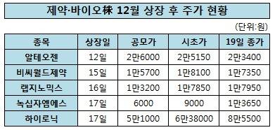 공모주 청약경쟁률이 높아 주가 상승 기대를 모았던 알테오젠과 비씨월드제약, 랩지노믹스 등은 코스닥 상장 후 약세를 이어가며 눈에 띄는 성적을 내지 못하고 있다.