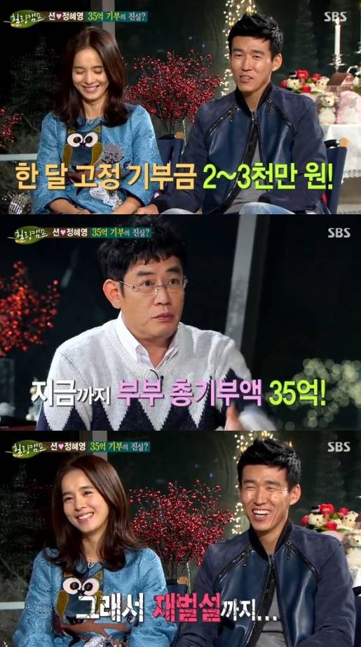 션 정혜영 부부가 지금까지의 총 기부액을 공개했다.션 정혜영 부부는 지난 22일 방송된 SBS '힐링캠프'에 출연해 한 달 고정으로 나가는 기부금과 함께 재벌설에 대해 해명했다.이날 MC 이경규는 션 정혜영 부부에게 "이 부부의 별명이 기부천사다. 한달에 고정적으로 나가는 기부금이 2~3천만 원이다. 그 동안 나간 기부금이 35억 원 정도라고 한다"고 밝혀 모두를 놀라게 했다.이에 션은 "강연도 하고 부부동반 CF도 찍었다. 작은 사업도 하고 있다. 아내 정혜영도 작품을 많이 안 하는 걸로 아시지만 꾸준히 1년에 한 편씩은 했다"고 밝혔다.정혜영 역시 "우리가 돈이 많아서, 돈을 쌓아 두고 있어서 기부하는 것이 아니다"고 거들었다.[션 정혜영 35억, 사진=SBS '힐링캠프' 방송 캡처]