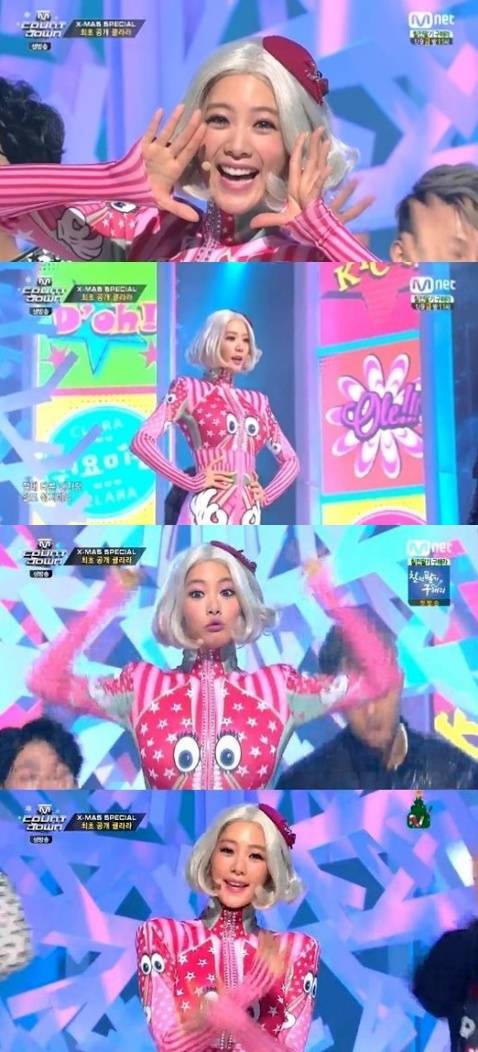 이날 클라라는 핑크색 전신 타이즈에 은발의 단발머리를 하고 '귀요미송2' 무대를 처음으로 선보였다. 특히, 깜찍한 표정과 따라하기 쉬운 댄스, 바비인형을 연상케 하는 완벽 몸매가 눈길을 끌었다.