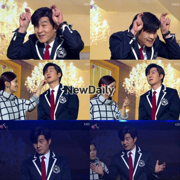 배우 김상중이 숨겨둔 개그본응을 한껏 발산했다.김상중은 지난 28일 방송된 KBS 2TV '개그콘서트-쉰밀회'에 깜짝 출연해 김대희, 김지민과 함께 호흡을 맞췄다.이날 김대희는 동생이자 아이돌 지망생으로 김상중을 소개했고, 교복을 입고 등장한 김상중의 모습에 김지민은 "아이돌? 아이 둘 있는 거 아니고?"라고 말해 웃음을 자아냈다.김상중은 "안녕하십니까. 선생님의 빛나는 면상을 뺏게 돼 영광이다. 96년생 유상중이다"라고 능청스럽게 자신을 소개했다. 이에 김지민은 "96년생? 뭐지? 대체 96년도에 무슨 일이 있었던 거야"라며 혼잣말을 했다.이어 김상중은 "반갑습니다. 선생님. 뿌잉뿌잉~"이라고 애교를 선보여 좌중을 폭소케 했다. 김지민은 "너 귀엽구나"라며 김상중의 볼을 꼬집었지만 이내 "피부에 탄력이 하나도 없어"라고 말했다.특히, 김상중은 SBS '그것이 알고 싶다' 배경음악에 맞춰 "1965년, 아니 1996년. 부산직할시, 아니 부산광역시에서 한 아이가 태어났다. 아이는 태어날 때부터 음악을 좋아했다. 그런데 말입니다"라고 설명해 웃음을 유발했다.[개콘 김상중, 사진=KBS2 '개그콘서트' 방송 캡처]