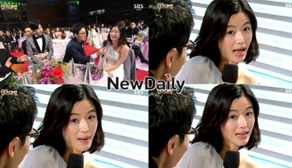전지현이 특급 애교로 남심을 사로잡았다.12월 31일 서울시 강남구 삼성동 코엑스D홀에서 생방송으로 진행된 '2014 SBS 연기대상'에서 MC 이휘재는 전지현에게 애교를 부탁했다.이날 이휘재는 무대 하단으로 내려가 배우들과 미니 인터뷰를 진행했다. 이휘재는 전지현에게 '별그대' 천송이 애교를 언급하며 "혹시가끔 남편에게 하는 애교가 있냐"고 물었다.이에 전지현은 "너무 부끄럽다"고 답했고, 이휘재는 "내가 더 부끄럽다. 개인적으로 너무 팬이어서 아내가 이렇게 인터뷰하는걸 별로 좋아하지 않을 거다"며 재차 애교를 요청했다.망설이던 전지현은 천송이로 빙의, 카메라를 향해 "여보 오늘 자지마"라고 애교를 보였으며, 이를 본 이휘재는 그대로 바닥에 쓰러졌다.[전지현 애교, 사진='2014 SBS 연기대상' 방송 캡처]