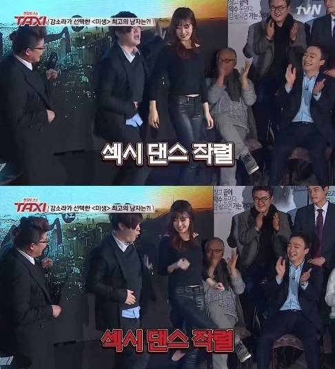 배우 강소라가 가죽바지를 입고 섹시댄스를 뽐냈다.지난 2일 방송된 tvN '현장토크쇼 택시'(이하 '택시')에서는 인기리에 종영한 드라마 '미생' 특집을 선보였다. 이에 이성민, 임시완, 강소라, 강하늘, 변요한, 김대명, 태인호, 전석호, 오민석, 이경영 등 12명의 주요 출연진과 함께 했다.이날 강소라는 몸매 비결에 대해 "제일 좋은 건 덜 먹고 많이 움직이는 거다. 많이 굶고 있다"고 솔직하게 털어놨다.또한, 강소라는 댄스를 보여달라는 MC 문희준의 요구에 주저하다 자리에서 일어나 매혹적인 섹시댄스로 모두의 감탄을 자아냈다.'택시' 강소라 섹시댄스를 접한 네티즌들은 "강소라 가죽바지에 댄스까지 섹시미 폭발", "택시 강소라 최고!", "강소라 가죽바지 아무나 소화 못해", "택시 강소라 정말 예뻐", "강소라 가죽바지 입으니 몸매 대박이야" 등의 반응을 보였다.['택시' 강소라 가죽바지, 사진=tvN '택시' 방송 캡처]