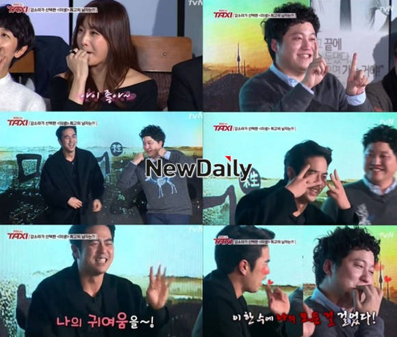 '미생' 김대명과 전석호가 '귀요미송' 대결로 깜찍한 매력을 발산했다.지난 2일 방송된 tvN '현장토크쇼 택시'(이하 '택시')는 드라마 '미생' 특집으로 꾸며진 가운데, 출연배우 12인과 함께한 토크쇼 '미생 신년회 1탄'이 전파를 탔다.이날 '강소라의 이상형 월드컵'에서 결승전 진출을 앞두고 김대명과 전석호는 "애교를 보고 싶다"는 강소라의 요구에 따라 귀요미송 대결을 펼쳤다.김대명은 처음 주저하다가 "에라 모르겠다. 지기 싫어"라며 "1 더하기 1은 귀요미. 2 더하기 2는 귀요미"라는 노래와 함께 깜찍한 율동을 선보여 웃음을 자아냈다.전석호 역시 이에 질세라 두 눈 질끈 감고 "3 더하기 3은 귀요미. 4 더하기 4는 귀요미"를 외쳤고, 이를 본 출연진들은 포복절도 했다. 하지만 강소라가 김대명을 꼽자 전석호는 드라마 '미생' 속 캐릭터로 돌아와 "야! 쓰레기통 비워와"라고 버럭 화를 내 폭소를 유발했다.[김대명 귀요미송, 사진=tvN '택시' 방송 캡처]