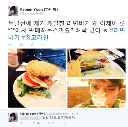 프랑스 출신 방송인 파비앙이 '라면버거' 원조 논란에 대해 해명했다.파비앙은 6일 자신의 트위터에 "두 달 전에 제가 개발한 라면버거 왜 이제야 롯***에서 판매 하는 걸까요? 허락 없이"라는 글과 함께 한 장의 사진을 올렸다.공개된 사진 속 파비앙은 MBC 에브리원 '100인의 선택-최고라면'에서 받은 '최고셰프' 트로피를 당당하게 들고 있다. 또 다른 사진에선 파비앙이 직접 만든 라면버거 사진이 눈에 띈다.이에 일부 네티즌은 "라면버거는 일본에서 먼저 만든 것이다"라고 파비앙의 '원조' 주장을 지적했다. 그러자 파비앙은 "농담 식으로 올린 것"이라고 해명해 눈길을 끌었다.'라면버거'는 지난 2013년 미국 뉴욕에서 일본인 요리사 케이조 시마모토가 처음으로 선보인 바 있다.한편, 6일부터 국민 간식 라면을 햄버거로 형상화한 메뉴인 '라면 버거'를 전국 롯데리아 매장에서 50만개 한정 판매한다.[라면버거 파비앙 원조 논란 해명, 사진=파비앙 트위터]