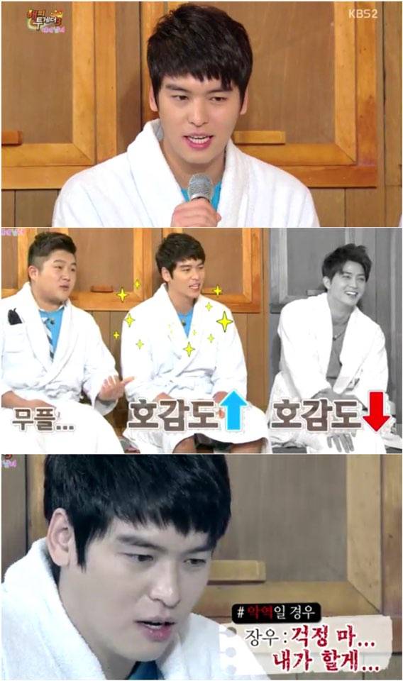 이장우가 남다른 예능감을 자랑했다.이장우는 8일 방송된 KBS 2TV '해피투게더3' 2015년 대세남녀 특집에 김지훈, 이채영, 한그루, 조세호, 이성경과 함께 출연해 화려한 입담과 뽐냈다.이날 방송에서 이장우는 사촌 형인 플라이투더스카이 환희의 성대모사를 완벽하게 재현해내 출연진들로부터 "히든싱어에 나가라"는 칭찬을 받으며 박수갈채를 받았다.또한 이장우는 자신의 '신의 한 수'로 시청률 43%를 기록한 KBS1 일일드라마 '웃어라 동해야'를 꼽아 눈길을 끌었다. 이어 당시 보여준 악역연기와 현재 출연중인 MBC 주말드라마 '장미빛 연인들'에서의 착한 연기를 직접 재연하며 차이점을 꼼꼼하게 설명해 스튜디오를 폭소케 했다.특히, 이장우는 그간 진중하면서도 카리스마 넘치는 모습과는 달리 성대모사부터 연기, 댄스까지 신선하면서도 솔직한 모습으로 드라마에 이어 예능까지 무공해 청정매력을 발산했다.한편, 이장우가 주연으로 출연하는 MBC 주말드라마 '장미빛 연인들'은 매주 토, 일요일 오후 8시 45분에 방영된다.[이장우 환희 사촌, 사진=KBS2 '해피투게더' 방송 캡처]