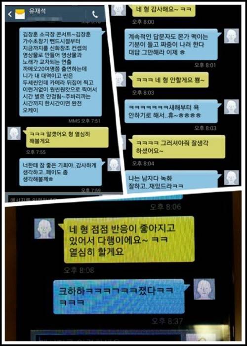 이에 유재석은 "알겠어요 형. 열심히 해볼게요", "네 형 감사해요", "네 형 안할게요" 등의 성실한 답변을 보냈다. 그러자 김장훈은 "계속 답문자에도 뭔가 먹이는 기분이 들고 짜증 나려한다. 대답 그만해라. 새해부터 욕 안하기로 해서"라며 농담을 건넸고, 유재석은 "그러셔야죠. 잘생각하셨어요"라고 여유롭게 맞받아쳤다.