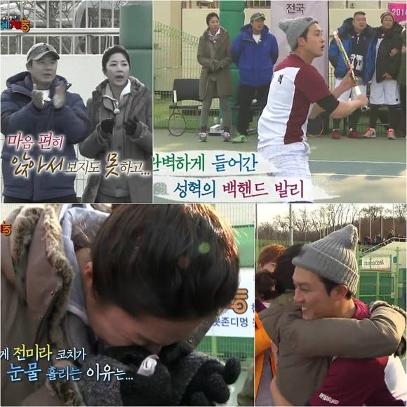이날 경기도 팀과의 경기에서는 폭풍눈물을 흘리는 전미라 코치의 모습이 포착되며 시청자들의 눈물샘을 자극했다. '예체능' 테니스 팀은 첫 경기 이재훈-양상국의 승리에 이은 강호동-신현준의 아쉬운 패배, 이어 정형돈-성시경의 짜릿한 역전승까지 2:1의 상황이었다. 그 가운데 마지막으로 네트에 선 팀이 바로 성혁-이광용 조였다.