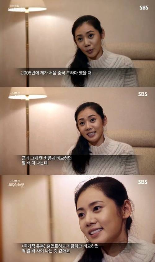 배우 추자현이 중국에서 받는 출연료를 공개했다.지난 18일 방송된 SBS 교양프로그램 'SBS 스페셜'에서는 '중국, 부의 비밀3-대륙 생존기' 편을 통해 중국에서 회당 1억 원의 출연료를 받는 스타가 되기까지의 과정을 소개했다.중국 연예계에 진출해 가장 성공한 스타로 꼽히는 추자현은 활동 8년 만에 현지에서 톱스타로 우뚝 서며 큰 인기를 누리고 있다.이날 추자현은 "중국에서 인기를 얻은 게 믿겨지지 않는 부분도 있다. 아직도 잠에서 깨면 옛날 힘들었을 때로 돌아갈 거 같다"고 털어놨다.또한, 추자현은 출연료에 대해 "맨 처음과 비교하면 10배. 딱 10배 차이 난다. '회가적 유혹'(한국 '아내의 유혹' 리메이크 작품) 출연했을 때와 지금하고 비교해서 딱 10배 정도 차이 나는 것 같다"고 말했다.이어 "문화의 차이가 있는 사람들에게 감정을 움직이는 노력은 참 많이 힘들다"라며 "출연료 기사 이후 한국 사람들이 단순히 '추자현 중국 가니깐 이 정도 받는대'라고 그렇게 한 두 줄로 끝나는 게 아쉽다"라고 아쉬움을 토로했다.[추자현 출연료, 사진='SBS 스페셜' 방송 캡처]
