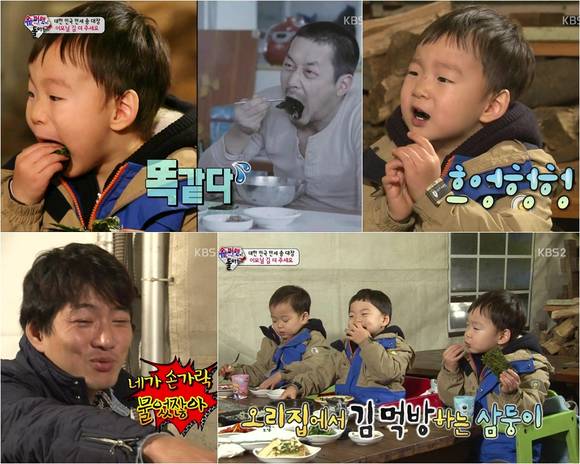 하정우를 능가하는 삼둥이 대한이의 김 먹방이 '슈퍼맨이 돌아왔다' 분당 최고 시청률을 기록하며 명실상부한 최고 먹방 대세로 떠올랐다.18일 방송한 KBS 2TV '해피선데이-슈퍼맨이 돌아왔다’'(이하 '슈퍼맨')의 '무럭무럭 자란다' 편에서는 낯선 만남도, 힘든 도전도 웃으며 극복해내는 아이들의 모습이 대견함을 느끼게 했다.그 중 삼둥이는 아빠 송일국과 처음으로 스키를 타러 갔다. 컨디션이 안 좋았던 대한이를 빼고 민국과 만세는 처음으로 스키 강사들에게 스키를 배웠다. 조금 두려워하던 모습도 잠시, 아이들은 아빠가 없어도 강사의 도움으로 활강에 성공했다.삼둥이들은 생애 첫 스키의 피곤함을 오리구이로 보충했다. 오리구이 흡입에 있어서도 삼둥이의 모습은 모두 달랐다. 껍질의 떼고 고기만 먹는 만세, 껍질만 맛있게 먹는 민국, 껍질과 고기를 모두 흡입하는 대한이까지 3인 3색의 다양한 먹는 모습은 시청자들의 군침을 당기게 하기 충분했다.그런데 최고의 먹방은 다른데 있었다. 바로 오리구이의 반찬으로 나왔던 구운 맨 김이었다. 시골 체험에서 맨밥을 맛깔스럽게 흡입하며 새로운 먹방 대세의 탄생을 알렸던 대한. 이번에도 대한은 맨 김을 입안에 쏙쏙 넣더니 카메라를 향해 엄지 손가락을 척 들어 보이며, 하정우를 능가하는 김 먹방을 선보였다.급기야 대한은 김 먹방에 열을 올리다가 자신의 손가락까지 먹어버려 웃음을 자아냈다. 대한은 김을 먹을 때는 세상을 다 가진 듯 행복한 웃음을 짓다가, 손가락을 깨물자 순식간에 눈물이 그렁그렁해져 이를 지켜보는 송일국뿐만 아니라 시청자들에게도 큰 웃음을 선사했다. 특히, 이 순간 시청률이 24.10%(닐슨 코리아 기준)까지 치솟으며 ‘슈퍼맨’의 분당 최고 시청률을 기록했다.대한이의 김 먹방에 시청자들은 각종 커뮤니티 게시판을 통해 "대한이는 맨밥에 이어 맨김까지 입맛이 토속적이어서 사랑스러워", "대한이 김 먹는데 눈이 휘둥그레 지는 줄", "삼둥이는 먹는 법도 다양해서 보는 재미가 3배", "대한이 김 먹다 손가락 깨물고 울먹울먹할 때 귀여워 죽는 줄!", "대한이 매력이 매일 매일 새롭구나" 등 뜨거운 반응을 보였다.['슈퍼맨' 삼둥이 김먹방, 사진=KBS2 '슈퍼맨이 돌아왔다' 방송 캡처]