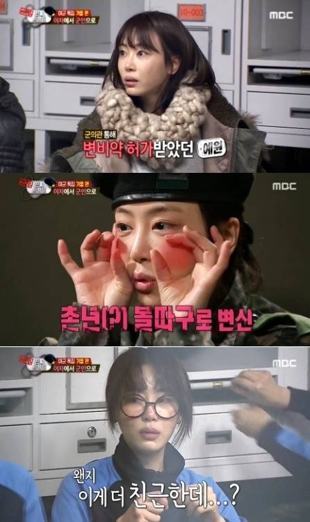 '진짜사나이' 강예원이 민낯을 공개했다.지난 25일 방송된 MBC '일밤-진짜사나이 여군특집2'에서는 부사관 후보생이 되기 위한 김지영, 박하선, 강예원, 이다희, 이지애, 안영미, 윤보미, 엠버 등 멤버들의 입소과정이 그려졌다.이날 강예원은 소지하고 있던 약을 신고하던 중 소대장에게 변비가 있다고 솔직하게 고백하며 여배우의 내숭없는 면모를 보였다.또한, 강예원은 소지품 정리를 하다가 소대장과 비비크림 사용을 두고 신경전을 벌였다. 강예원은 "안면 홍조가 있다"면서 비비크림 사용을 허가해달라고 부탁했다.하지만 소대장은 이를 단호하게 거절했고, 이후 적나라하게 드러난 강예원의 안면홍조 민낯이 눈길을 끌었다.[진짜사나이 강예원 민낯, 사진=MBC '진짜사나이' 방송 캡처]