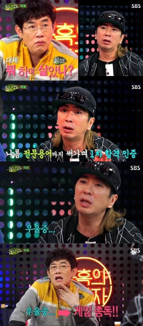 김정남이 우울중으로 게임중독에 빠졌던 사실을 고백했다.26일 방송된 SBS '힐링캠프, 기쁘지 아니한가'(이하 '힐링캠프')에서는 90년대 인기 돌풍을 이끌고 있는 터보 김종국과 김정남이 출연해 추억의 90년대 '힐링 나이트' 콘셉트로 꾸며졌다.이날 김정남은 "터보 해체 후 나이트클럽에서 행사를 뛰었다. 10년 동안 제법 부유하게 살았다"며 "수입이 줄자 힘들어졌다. 그때 누가 공인중개사 시험 치라고 해서 봤다. 1차에도 붙었다"고 털어놨다.이어 "음악을 포기하니 여기저기 아프기 시작했다. 가슴이 답답하더라. 인터넷으로 증상을 찾아보니 그게 우울증이었다"고 덧붙였다.또한, 김정남은 "부유하게 잘 지낼 때는 종국이를 생각하지 못했다. 어려워지니까 그때 김종국이 떠올랐다. 너무 어린 동생을 사지에 혼자 두고 나만 빠져나왔다는 생각이 들더라. 미안한 마음에 더 연락을 하지 못했다"고 밝혔다.그러면서 김정남은 "이후 게임에 중독되기도 했다. 내 뒤에 2천명이 있었다. 하루 22시간을 게임했다"고 말해 이목을 끌었다.['힐링캠프' 김정남 우울증 고백, 사진=SBS '힐링캠프' 방송 캡처]