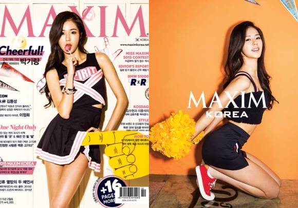 치어리더 박기량이 맥심 표지 모델로 등장했다.박기량은 치어리더를 콘셉트로 촬영된 MAXIM 2015년 2월호 표지화보에서 이전까지 보여주지 못했던 사랑스러운 매력을 보여주며 팬들의 많은 관심을 받고 있다.그녀는 선수들과 팬들에게 밝고 건강한 에너지를 전하는 치어리더답게 화보 촬영장에서도 시종일관 밝고 즐거운 모습으로 분위기를 주도했다.작업에 참여한 MAXIM 스태프들은 10시간이 넘는 촬영에도 미소를 잃지 않고 활력이 넘치는 박기량의 모습에 "역시 대한민국 No.1 치어리더는 다르다"며 그녀의 대단한 체력에 혀를 내둘렀다는 후문이다.촬영 후 가진 인터뷰에서 박기량은 "자신이 언제 가장 섹시해 보이느냐?"는 질문에 "샤워 후 젖은 머리가 몸에 착 붙어있을 때 가장 섹시해 보인다"고 답했다.이어 가장 자신 있는 부위에 대해 "팀원들이 콧구멍이 예쁘다고 칭찬하던데…"라고 웃으며 엉뚱한 매력을 발산했다. 또, 박기량은 "내가 '못 생겨서' 찼다던 전 남친이 지금 뼈저리게 후회하고 있다는 소식을 들었을 때 통쾌했다"고 말해 촬영장을 웃음바다로 만들었다.현재 박기량은 프로야구 롯데 자이언츠와 프로농구 모비스 피버스, KDB 위너스의 치어리더로 활약하고 있으며, 방송을 통해 팬들에게 다양한 매력을 선보이고 있다.[박기량 화보, 사진=맥심]