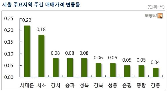 서울은 △서대문(0.22%) △서초(0.18%) △강서(0.08%) △송파(0.08%) △성북(0.08%) 순으로 올랐다. 서대문은 홍제동, 홍은동을 중심으로 매매전환이 이루어 지며 가장 높은 상승률을 보였다.