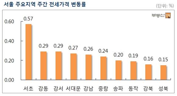 서울은 △서초(0.57%) △강동(0.29%) △강서(0.29%) △서대문(0.27%) △강남(0.26%) △중랑(0.24%) 순으로 전셋값이 상승했다. 겨울 이사 비수기임에도 불구하고 재건축 이주와 학군 수요가 맞물리면서 오름세가 지속되고 있다.