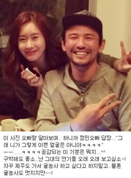 가수 김원준에게 호감을 드러낸 배우 김지수의 근황이 포착됐다.김지수는 1월 28일 자신의 페이스북에 "오빠랑 닮아 보인다고 하니까, 정민 오빠 답장 '그래 네가 그렇게 예쁜 얼굴은 아니야' 공감되는 이 기분은 뭐지"라는 글과 함께 한 장의 사진을 게재했다. 김지수 김원준이어 김지수는 "구박해도 좋소. 난 그대의 연기를 오래오래 보고 싶소. 자꾸 제주도 가서 귤 농사짓고 싶다고 하지 말고. 물론 귤 농사도 멋지지만"이라고 덧붙였다.공개된 사진 속 편안한 옷차림의 김지수와 황정민은 카메라를 향해 브이자를 그리며 환하게 웃고 있다. 특히, 두 사람의 오누이 같은 다정한 케미가 훈훈함을 자아낸다.한편, 김지수는 지난 1일 방송된 SBS '런닝맨'에서 송지효의 절친으로 출연해 '우정의 금가방 레이스'를 펼쳤다. 이날 송지효는 유재석과 함께 달고나 미션에서 김지수와 김원준을 이어주려 즉석 소개팅을 마련했다. 김지수와 김원준은 '하트 달고나'를 주고받으면서 달달한 기류를 형성했다.특히, 김원준 어떠냐는 송지효의 질문에 김지수는 "원준 씨 넘 잘 생겼고 예쁘게 생겼고 다 좋지. 아마 나랑 동갑일 걸. 근데 진짜 나이 안 들어 보인다"고 호감을 드러내 이목을 끌었다.[사진=김지수 페이스북]