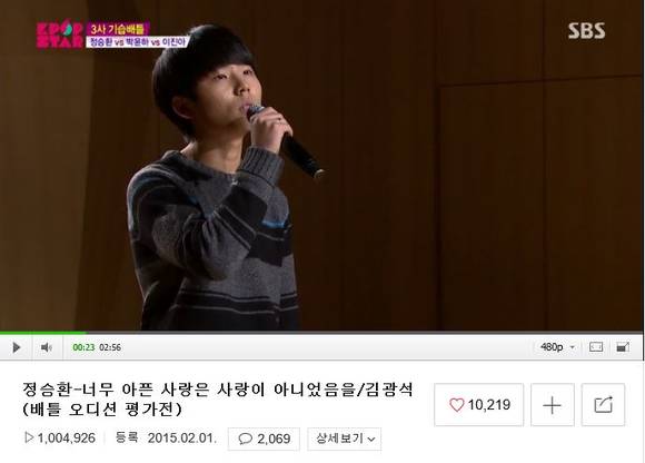 'K팝스타4'(케이팝스타4) 정승환의 '너무 아픈 사랑은 사랑이 아니었음을' 무대 영상 다시 보기가 100만뷰를 돌파, 전무후무한 '정승환 신드롬'을 이어가고 있다.