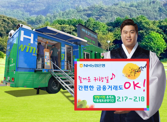 농협은행이 설 명절을 맞아 고향을 방문하는 고객들의 금융편의를 위해 경부고속도로 부산방향 망향휴게소와 중부고속도로 통영방향 이천휴게소에서 오는 17~18일 이틀간 이동점포를 운영한다.