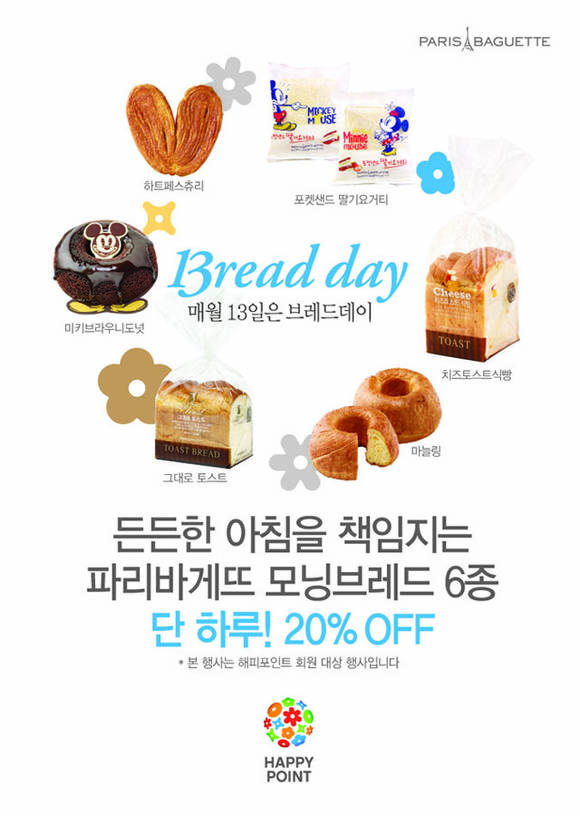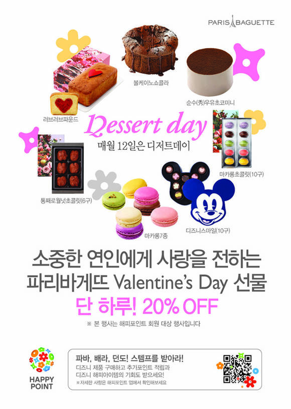 파리바게뜨의 '디저트데이'와 '브레드데이'가 발렌타인데이를 앞두고 찾아왔다.파리바게뜨가 12일 '디저트데이'와 13일 '브레드데이'를 맞아 인기제품과 함께 디즈니 콜라보레이션 제품을 20% 할인된 가격에 선보인다고 11일 밝혔다.'디저트데이'에는 초콜릿과 마카롱은 물론 디즈니 콜라보레이션 제품이 더해졌다. 미키와 미니 패키지에 디즈니 아이콘 초콜릿을 담은 '디즈니스마일', 발렌타인데이 선물에 잘 어울리는 '러브러브파운드'와 프리미엄 견과 초콜릿 '통째로 호두 초코' 그리고 인기 디저트인 '마카롱 7종', '순수(秀)우유초코 미니케이크', 신제품 '볼케이노 쇼콜라' 등 10종을 기분 좋은 혜택으로 만나볼 수 있다.'브레드데이'에는 2월 출시된 신제품과 인기제품을 20% 가벼운 혜택으로 만나볼 수 있다.이 행사는 해피포인트 고객이라면 누구나 참여가능하며, 해피포인트 고객이 아니더라도 즉석에서 해피포인트 앱에 가입해 혜택을 받을 수 있다.파리바게뜨 관계자는 "이번 디저트데이와 브레드데이는 발렌타인데이 제품과 갓 출시된 신제품을 특별한 가격으로 경험할 수 있는 기회인 만큼 많은 고객에게 혜택이 돌아가길 바란다"고 전했다.