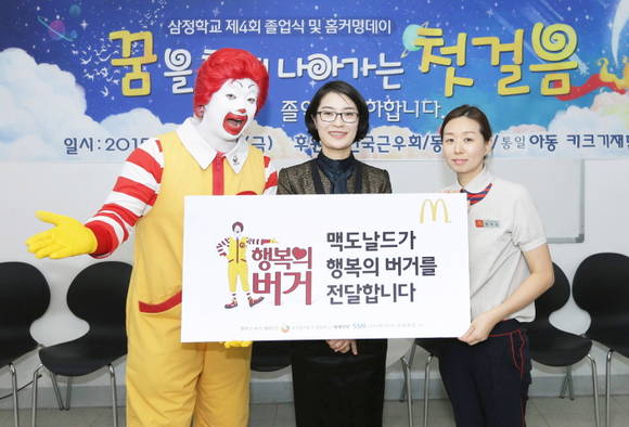 맥도날드가 새터민 어린이들에게 버거와 음료 300인분을 전달했다고 17일 밝혔다.지난 13일 서울시 구로구에 위치한 새터민 어린이 대안학교인 삼정학교 졸업식에 참석한 어린이와 가족들에게 300인분의 버거와 음료를 전달한 맥도날드의 이번 행사는 대표적인 사회공헌 프로그램 중 하나인 '행복의 버거' 캠페인의 일환으로 진행됐다.이날 행사에는 맥도날드 직원들이 일일 자원봉사자로 나서 참석자들에게 버거와 음료를 직접 전달했다. 맥도날드의 최고행복책임자(CHO, Chief Happiness Officer)인 로날드 맥도날드도 행사장을 찾아 어린이들과 함께 사진 촬영을 하는 등 즐거운 추억을 선사했다.맥도날드 조주연 부사장은 "새터민 어린이와 가족들을 위한 뜻 깊은 자리에 맥도날드가 함께 하게 돼 매우 기쁘게 생각한다"며 "앞으로도 맥도날드는 '행복의 버거' 캠페인을 통해 우리 주변의 따뜻한 관심이 필요한 이웃들에게 행복을 전달하고 사랑을 실천하는 기업이 될 수 있도록 노력할 것"이라고 전했다.