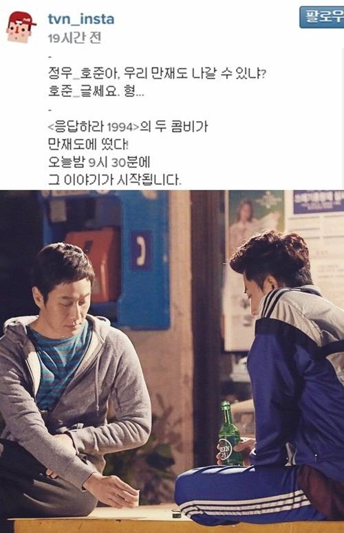 '삼시세끼' 정우와 손호준의 덤댄더머 과거가 포착됐다.지난 13일 tvN 공식 인스타그램에는 "호준아, 우리 만재도 나갈 수 있냐?..글쎄요 형"이라는 글과 함께 손호준과 정우의 드라마 '응답하라 1994' 스틸컷이 올라왔다.공개된 사진 속 정우와 손호준은 심각한 표정을 지으며 소주 한잔을 주고 받고 있다. 특히, 두 사람의 모습은 만재도에서 겪은 수난과 묘하게 맞아떨어지며 보는 이들의 웃음보를 자극한다.20일 방송될 tvN 자급자족 어부 라이프 '삼시세끼-어촌편'에는 정우를 비롯해 고정 멤버인 차승원, 유해진, 손호준이 해물찜 도전 등 한끼 해결을 위한 고군분투를 펼치며 깨알 재미를 선사할 예정이다.정우가 게스트로 출연하는 '삼시세끼 어촌편' 5회는 20일 밤 9시 45분 방송된다.['삼시세끼' 정우 손호준, 사진=tvN 공식 인스타그램]