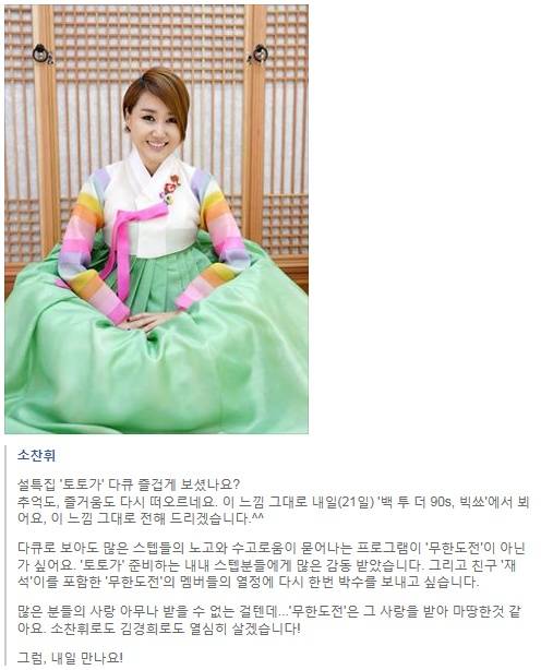 이어 "많은 분들의 사랑 아무나 받을 수 없는 걸텐데, '무한도전'은 그 사랑을 받아 마땅한것 같아요. 소찬휘로도 김경희로도 열심히 살겠습니다. 그럼, 내일 만나요"라고 덧붙이며 21일 있을 '빅쑈'에 대한 기대감을 드러냈다.