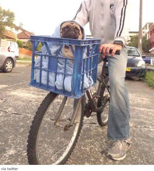 주인으로 보이는 남자의 자전거 앞 바구니에 타고 있는 이 강아지는 마치 영화 속 'ET'의 모습을 연상케 한다.