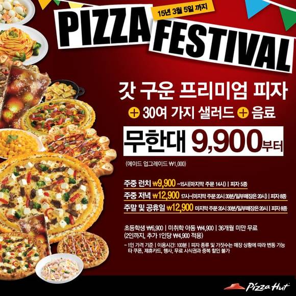 피자헛이 30주년 기념 이벤트 '피자 페스티벌' 이벤트를 내달 5일까지 연장한다고 24일 밝혔다.피자헛은 지난해 10월, 갓 구운 피자와 샐러드 키친, 탄산 음료를 100분 동안 무제한으로 즐길 수 있는 피자 페스티벌을 선보였다. 이벤트가 지속적인 인기몰이로 이용자 40만 명을 돌파하자, 피자헛은 당초 1월 31일까지였던 이벤트를 내달 5일까지로 연장한 것이다.피자 페스티벌은 프리미엄 피자와 베스트 피자가 한 조각 단위로 제공돼 다양한 종류의 피자를 보다 편리하고 풍성하게 즐길 수 있는 것이 장점이다. 주중 점심은 5종의 피자를 9900원에, 주중 저녁과 주말에는 8종의 피자를 1만 2900원의 파격적인 가격에 이용 가능하다.한국 피자헛 마케팅팀 조윤상 이사는 "경기가 좋지 않은 요즘, 피자 페스티벌이 알뜰한 외식 생활을 즐기려는 고객들의 니즈에 부합하면서 긍정적인 입소문 효과가 있었다"라며 "특히 올해는 피자헛 30주년을 맞이하여 피자의 맛과 품질은 물론 매장에서의 특별한 추억까지 함께 선사하는 다양한 프로그램을 보여드릴 계획이다"라고 설명했다.