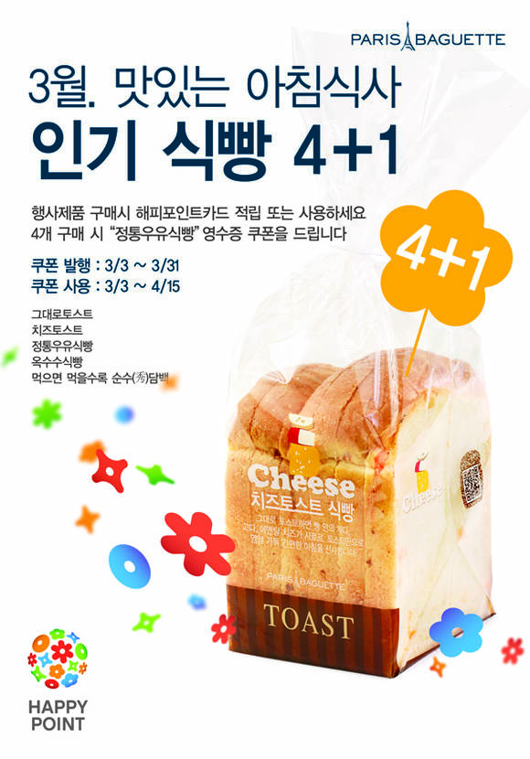 파리바게뜨가 '인기식빵 4+1' 이벤트를 실시한다고 2일 밝혔다.해피포인트 고객을 대상으로 하는 이번 행사는 오는 3일부터 31일까지 진행되며 행사 기간 내 식빵 4개를 구매하면, '정통우유식빵'으로 교환할 수 있는 영수증 쿠폰을 제공한다.'인기식빵 4+1' 이벤트 대상 제품은 파리바게뜨에서 가장 인기가 많은 식빵 5가지로, '그대로 토스트' '정통우유식빵', '먹으면 먹을수록 순수秀담백' '옥수수식빵' '치즈토스트' 등이 포함되어 있다.식빵의 구매횟수는 해피포인트 카드를 사용하거나 적립할 경우 자동으로 기록된다. 남은 구매횟수와 증정쿠폰은 영수증을 통해 확인할 수 있으며 증정된 '정통우유식빵' 쿠폰의 사용 기간은 내달 15일까지다.파리바게뜨 관계자는 "점차 아침대용식으로 식빵 수요가 늘고 있는 만큼 파리바게뜨 식빵을 꾸준히 애용해주시는 고객들을 위해 감사의 마음으로 증정 이벤트를 마련했다"고 밝혔다.