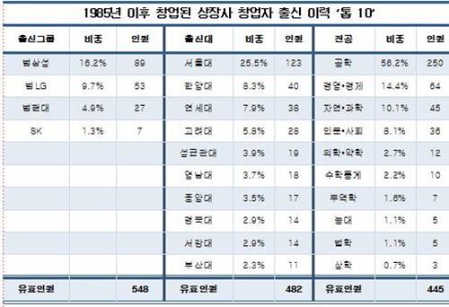 창업자의 출신 대학은 서울대가 압도적으로 많았다. 학력을 공개한 창업자 482명 중 123명(25.5%)이 서울대 출신으로, 4명 중 1명꼴이었다.