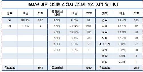 이들 창업자의 전공은 대다수가 공학계열이었고, 4명 중 1명은 서울대 졸업자였다. 출신 지역은 영남이 가장 높았다.