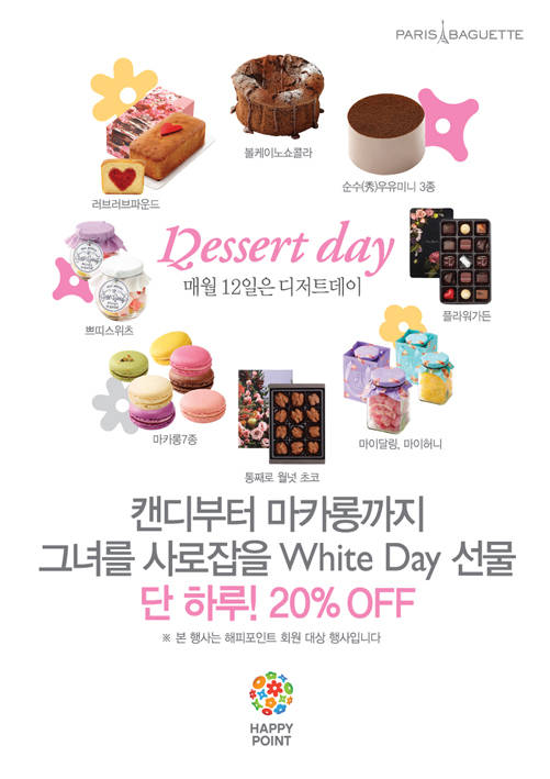 파리바게뜨가 화이트데이를 앞두고 매달 12일 진행하는 '디저트데이'에 인기 디저트류 8종을 20% 할인된 가격으로 선보인다고 12일 밝혔다.최근 화이트데이 선물로 베이커리 디저트가 각광받고 있는 만큼, 보다 합리적인 가격으로 여심을 사로잡을 수 있는 선물을 준비할 좋은 기회가 될 것으로 기대된다.디저트의 대명사 '마카롱 7종'을 비롯해 과일모양이 돋보이는 '쁘띠스위츠'와 '마이달링, 마이허니' 등의 수제캔디 제품, 예쁜 플라워 패키지로 단장한 '플라워가든', '통째로 월넛 초코' 등 초콜릿 제품을 디저트데이에 선보인다.이밖에도 강렬한 빨강색 하트무늬가 눈길을 끄는 '러브러브파운드', 밀가루는 빼고 촉촉함을 채운 '볼케이노 쇼콜라', 파리바게뜨의 대표 인기제품 '순수(秀)우유미니 3종' 등 케이크류 3종이 포함된다.파리바게뜨 관계자는 "3월은 화이트데이와 신학기로 대표되는 만큼 이에 맞춤형 혜택을 제공할 수 있도록 디저트데이와 브레드데이 품목을 구성했다"며 "보다 합리적인 가격으로 풍성한 화이트데이를 준비하시길 바란다"고 밝혔다.