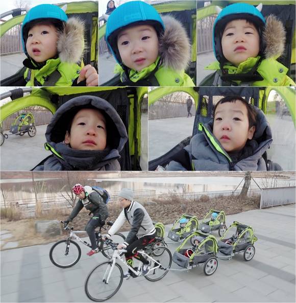 '오둥이' 대한 민국 만세 서언서준이 공원을 평정했다.15일 방송될 KBS 2TV '해피선데이-슈퍼맨이 돌아왔다'에서 새 집으로 이사한 이휘재는 쌍둥이 서언 서준과 생일이 하루 차이 밖에 안 나는 송일국의 삼둥이 대한 민국 만세를 집으로 초대해 생일축하 겸 집들이를 갖는다.이날 '삼둥이' 대한 민국 만세와 '쌍둥이' 서언 서준은 삼둥이 트레이드 마크인 송국열차까지 함께하며 완벽한 '오둥이' 형제로 거듭났다.수시로 아빠와 함께 자전거 라이딩을 즐기는 삼둥이에 비해 자전거 트레일러를 처음 타보는 서언 서준은 바짝 긴장 탓에 몸도 얼굴도 꽁꽁 얼어 붙은 '얼음인형'으로 변신해 웃음을 자아냈다. 그러나 무서움도 잠깐, 쌍둥이는 삼둥이 형들과의 상쾌한 라이딩에 어느새 마음을 열고 바람을 즐겨 흐뭇한 미소를 짓게 만들었다.속도를 즐기기 시작한 오둥이는 공원을 산책하는 시민들을 향해 "안녕하세요!"라며 깜찍한 인사를 건네는가 하면, "소리질러~"라고 외치는 송일국의 선창에 합동 환호성을 선보이며 고요했던 공원에 생기발랄한 에너지를 발사했다.KBS2 '슈퍼맨이 돌아왔다' 69회 '언제 이렇게 컸니?' 편은 15일 오후 4시 50분에 방송된다.['슈퍼맨이 돌아왔다' 오국열차, 사진=KBS]
