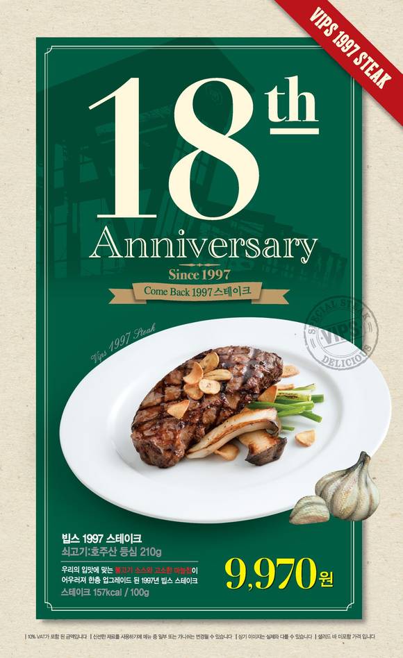 빕스가 오픈 18주년을 기념해 한정판 메뉴인 '1997 스테이크'를 선보인다.17일 CJ푸드빌은 이번 '1997 스테이크'를 오는 18일부터 25일까지 9970원에 판매한다고 밝혔다. 이는 지난 6일부터 진행 중인 샐러드 바 1997원 행사에 이은 두 번째 고객 감사 이벤트로, 샐러드 바 이용 고객에게 제공한다.'1997 스테이크'는 빕스가 서울 등촌동에 첫 매장을 연 1997년을 상징하는 네이밍으로 초창기 전 연령층에 큰 사랑을 받았던 불고기 소스 맛의 스테이크를 18주년에 맞춰 복고풍 스테이크로 재해석한 것이다.또한 가격은 낮추고 양은 푸짐하게, 그리고 그 당시 출시한 메뉴의 분위기를 느낄 수 있도록 이전 레서피(불고기 소스 사용 등)를 활용하면서도 현대적 스타일의 조리 기법을 가미한 게 특징이다.스테이크 자체의 육질을 중시하는 소비자 트렌드를 반영, 과거처럼 불고기 소스를 재워 굽지 않고 먼저 브로일링(Broiling, 직화 구이)으로 스테이크를 구워낸 후 소스는 나중에 바르는 방식으로 변화를 줬다. 브로일링 방식은 스테이크 특유의 격자 무늬가 생겨 불의 향을 한층 더 느낄 수 있게 해준다.특히 1997 스테이크는 평일 점심 1만원대의 금액으로 추가 주문 가능한 '런치 스페셜 스테이크'에 비해 낮은 가격으로 중량은 많게(210g) 즐길 수 있게 했다. 행사 기간 동안 점심, 저녁에 상관없이 샐러드 바 이용 고객에 한해 추가 주문 가능하다.CJ푸드빌 관계자는 "이번 한정 판매로 선보이는 1997 스테이크는 빕스의 오랜 고객들에게 옛 추억을 떠올리게 하는 특별한 메뉴가 될 것"이라며 "앞으로도 고객과 함께 호흡하고 성장하는 친근한 외식 브랜드가 되도록 계속 노력하겠다"라고 말했다.