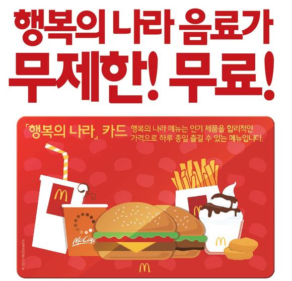 맥도날드는 24일 행복의 나라 메뉴 음료를 무제한 무료로 즐길 수 있는 '행복의 나라 카드'를 출시한다.카드를 소지한 고객은 오는 25일부터 내달 30일까지 맥도날드에서 판매되는 모든 버거 또는 머핀 단품을 구매하면 구매영수증 1장당 탄산음료, 프리미엄 로스트 원두커피, 아이스 커피와 같은 행복의 나라 메뉴 음료 1잔을 무료로 받을 수 있다. 행복의 나라 카드의 판매가격은 1900원이며, 프로모션 기간 동안 사용 시간과 횟수 등에 제한이 없다.맥도날드 마케팅팀 조주연 부사장은 "맥도날드는 좋은 품질의 제품을 합리적인 가격에 제공해 고객들에게 맥도날드에서만 누릴 수 있는 특별한 경험과 가치를 선사하기 위해 노력하고 있다"며 "새로 출시된 '행복의 나라 카드'를 이용하면 행복의 나라 메뉴의 음료를 제한 없이 무료로 즐길 수 있는 만큼 더욱 부담 없이 맥도날드를 찾아 주시기 바란다"고 말했다.