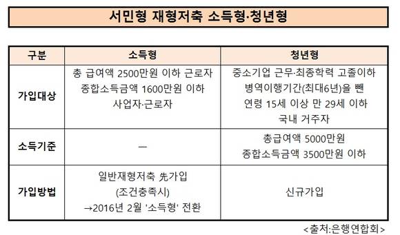 은행연합회 관계자는 "소득형 가입자는 일반 재형저축으로 가입을 먼저하고 조건이 맞으면 내년 2월 소득형으로 자동 전환되지만, 청년형의 경우 새로 가입을 해야 재형저축의 비과세 혜택을 볼 수 있기 때문에 가입가간을 최대한 길게 둬 혜택을 많이 받을 수 있도록 했다"고 설명했다.