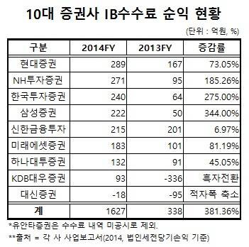 미래에셋증권은 2013년 101억원이던 IB수수료 수익이 81.19%(82억원) 오르면서 지난해 183억원을 기록했고, 하나대투증권도 45.05%(41억원) 신장한 132억원으로 그 뒤를 이었다. KDB대우증권 역시 336억원 적자에서 지난해 93억원으로 흑자전환에 성공했다.