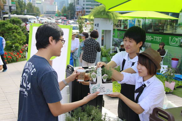특히 지난해 9월에는 서울시가 주관하는 제3회 도시 농업 박람회에 동참해 커피찌거기를 재활용한 친환경 커피 퇴비 3000포와 롯데리아, 엔제리너스 일회용 투명컵을 화분으로 재활용해 모종과 퇴비를 함께 증정하기도 했다.