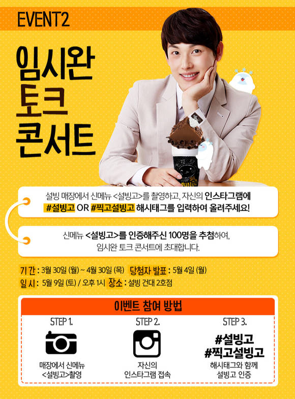 설빙이 공식모델인 임시완과 함께 하는 토크콘서트를 개최한다고 20일 밝혔다.이번 토크콘서트는 설빙의 신메뉴인 설빙고의 출시를 기념하는 한편 설빙을 아껴주는 고객의 성원에 보답하기 위한 스페셜 이벤트의 일환으로 마련됐다.설빙에서 처음으로 개최하는 이번 '임시완 토크콘서트'에서는 가수에서 배우로 거듭나며 대세로 등극한 임시완과 진솔한 이야기를 나누는 한편 색다른 디저트 설빙고의 다양한 맛을 한 자리에서 만나볼 수 있다.이번 토크콘서트는 내달 9일 오후 1시 설빙 건대2호점에서 열리며 참가신청은 오는 30일까지다. 설빙 매장에서 신 메뉴인 설빙고를 촬영해 '#설빙고' 혹은 '#찍고설빙고' 해시태그를 입력해 자신의 인스타그램에 업로드하는 방식으로 참여할 수 있으며, 추첨을 통해 내달 4일 100명의 당첨자를 발표할 예정이다.설빙 홍보마케팅실 김동한 팀장은 "이번 토크콘서트는 설빙을 아껴주는 고객들과 직접적인 만남을 통해 소통하고 성원에 감사하기 위한 스페셜 이벤트"라며 "신메뉴인 설빙고의 반응이 좋은 만큼 토크콘서트 참가신청 역시 매우 활발하게 이어지고 있다"고 전했다.