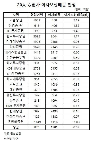 이 기간 동안 영업손실을 기록한 회사는 기존 9개사(KDB대우·삼성·현대·대신·유안타·하이투자·HMC투자·동부·한화투자증권)에서 유안타증권 한 곳으로 줄었고, 이자보상배율 1배를 넘는 회사는 기존 2곳(키움·신영증권)에서 4곳(키움·신영·KB투자·한국투자증권)으로 늘었다.