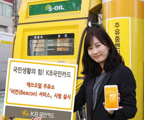 KB국민카드(사장 김덕수)가 에쓰오일(S-Oil)과 손 잡고 모바일 앱카드 ‘K-모션’을 통해 할인 행사, 할인 쿠폰 등 다양한 마케팅 메시지를 받을 수 있는 '비컨(Beacon)' 서비스를 실시한다.스마트폰의 위성위치확인시스템(GPS)을 켜 놓은 상태로 주유소에 진입하면 블루투스 기반 무선통신장치(비컨)가 설치된 서울 소재 50여 개 에쓰오일 주유소에서 이를 인식하는 것이다.이 서비스는 오는 6월부터 시범 운영될 예정이다. 주유 후에는 바코드 리더기를 통해 플라스틱 카드 업이도 휴대전화에 장착돼 있는 모바일 카드로 결제할 수 있다.KB국민카드 관계자는 “에쓰오일 주유소에 이어 비컨 서비스 확대를 위해 현재 일본 대형 아울렛과도 협의를 진행하고 있다”며 “보다 편리한 모바일 결제 환경을 고객들에게 제공할 수 있도록 앞으로도 차별화된 스마트 금융 서비스를 다양하게 선 보일 계획”이라고 했다.