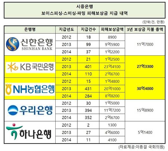 시중은행이 가입한 ‘전자금융거래 배상책임보험’으로 지난 2012년부터 3년간 지불한 피해보상금 내역을 분석한 결과 NH농협은행과 국민은행은 각각 30억 4000만원, 27억 3300만원을 고객에게 보상해준 것으로 나타났다. 또한 5대 시중은행의 지급건수 2232건 중 NH농협은행, 국민은행이 차지하는 비중이 1262건으로 절반을 넘는다.