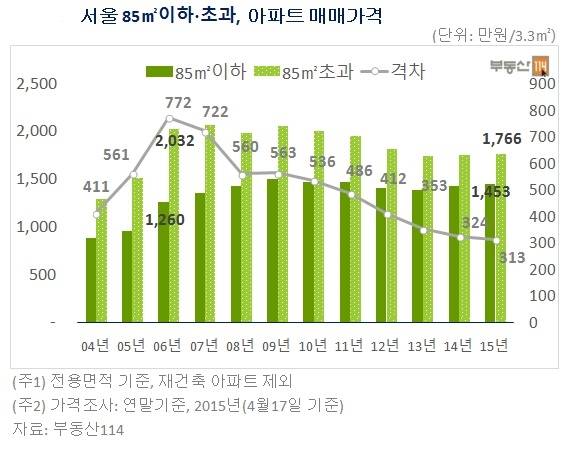 소형·중대형의 가격 격차는 2008년 글로벌 금융위기 기점으로 줄어드는 추세다. △2009년 (563만원) △2010년 (536만원) △2011년 (486만원) △2012년 (412만원) △2013년 (353만원) △2014년 (324만원) △2015년 (313만원) 등 지속적으로 줄고 있다. 이는 주택경기 침체와 인구구조 변화, 전세난 등으로 중소형 면적에 대한 선호도가 높아져서다.