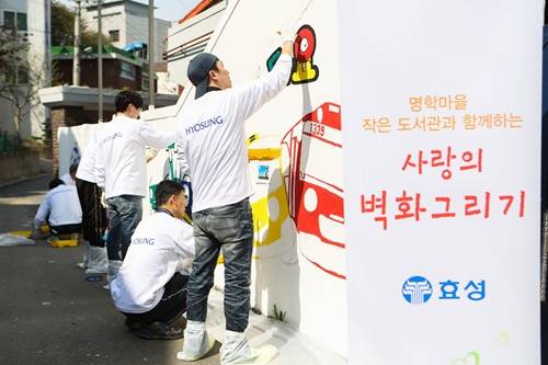 '사랑의 벽화그리기'가 진행된 경기도 안양시의 명학마을은 효성 인력개발원이 위치한 안양공장과 인접해 있는 곳으로, 도로와 마을 벽이 어두워 금번 벽화그리기를 통해 밝고 화사한 마을로 새롭게 태어나게 됐다.