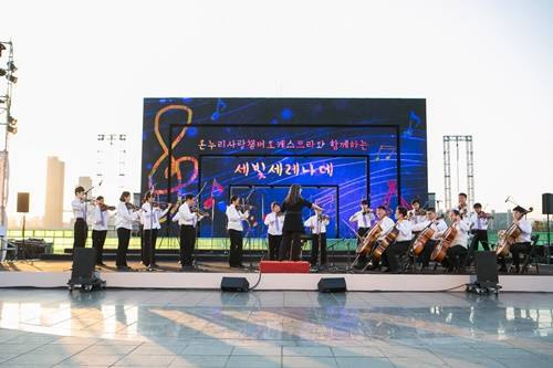 영화 '어벤져스2'로 더욱 유명해진 효성 세빛섬에 오케스트라의 향연이 펼쳐졌다.효성이 후원하고 있는 '온누리사랑챔버오케스트라'가 지난 23일 저녁 반포 한강공원 내 세빛섬 야외 무대(예빛섬)에서 '세빛 세레나데'라는 제목으로 연주회를 가진 것이다.이날 온누리사랑챔버오케스트라는 오후 7시부터 90분간 'Over The Rainbow', 'You Raise Me Up' 등 약 20곡의 수준 높은 공연을 선보였다.관객들은 단원들의 멋진 공연에 화답의 뜨거운 박수를 보내는 등 감동과 공감대가 어우러진 공연이 펼쳐졌다.온누리사랑챔버오케스트라는 지난 1999년 5월 설립된 관현악단으로 발달 장애ㆍ지적 장애 아동 청소년 80여명으로 구성되어 있다.이번 공연은 효성이 지난 9월, 악기구입ㆍ음악캠프ㆍ장학금 등으로 1억원을 후원한지 약 8개월만에 열린 기념공연이다.조현상 효성나눔봉사단장은 "문화관광 복합공간인 세빛섬에서 진행한 온누리사랑챔버오케스트라 단원들의 공연을 통해 세빛섬을 찾은 많은 시민들이 큰 감동을 받았다"며 "앞으로도 효성은 장애인 음악 활동 지원을 포함한 다양한 문화예술 활동 후원을 통해 한국을 대표하는 문화예술후원 기업이 되기 위해 노력하겠다"고 밝혔다.한편, 효성은 '요요마와 실크로드 앙상블'과 함께 지난 2010년부터 다문화가정 청소년 및 장애아동을 대상으로 '티칭 클래스'를 개최해 음악 꿈나무들에게 희망을 선사하고, 학교폭력 예방 뮤지컬을 만드는 '사단법인 아리인'을 후원하는 등, 도움이 필요한 계층의 문화 향유 기회 제공을 위해 노력하고 있다.
