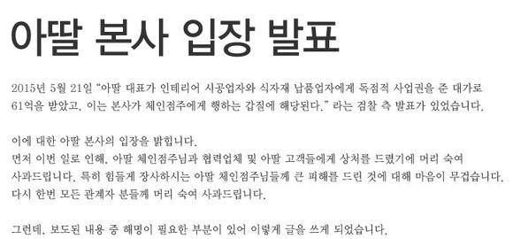 떡볶이 프랜차이즈 '아딸'의 대표 이모(42) 씨가 식재료와 인테리어 업자에게 수십억 원의 뒷돈을 받아 챙긴 혐의로 구속됐다. 하지만 본사 측은 공식성명서를 통해 혐의에 대해 반박하며 소비자들에 호소하고 있는 상황. '무혐의'를 주장하는 아딸 본사와 검찰이 대립각을 세우고 있어 귀추가 주목되고 있다.지난 21일 서울남부지검 금융조사1부(부장 박찬호)는 음식재료 공급과 인테리어 독점 계약을 맺는 대가로 업자들로부터 수십억을 받은 혐의로 이 대표를 구속했다고 밝혔다.검찰에 따르면 이 대표는 2008년부터 2012년까지 전국 아딸 가맹점의 인테리어 및 식재료 납품 특혜의 대가로 인테리어 업자와 식재료 공급업체로부터 뒷돈 60여억 원을 받은 혐의를 받았다. 또한 이 대표는 세무당국의 눈을 피하기 위해 한 교회를 통해 30여 억원을 송금받은 정황도 드러났다.이는 고스란히 가맹점주들의 부담으로 이어지면서 비싼 인테리어와 식재료 비용을 점주들이 메워야 했다.하지만 아딸 측은 "이미 2014년 서울동부지검 조사 후 무혐의 판정을 받은 사항"이라며 강력 반발에 나섰다.아딸은 2012년까지 식자재를 납하던 A업체가 식자재 외상매입금을 과다하게 연체하게 됐고, 1년 이상의 상환기회를 줬음에도 개선의 여지가 없자 식자재 납품업체를 교체했다. 이에 A 업체는 "과거 리베이트 준 것을 폭로하겠다"고 협박, 아딸은 서울동부지검에 수사를 직접 요청했고 5개월간 조사받았다.서울동부지검은 지난 1월 해당 조사 결과를 발표, "A 식자재 납품회사에게 식자재 납품권한을 주고 수수료를 받은 것은 배임 및 횡령에 해당하지 않는다"고 결론냈다.더불어 아딸 측은 "인테리어 비용은 평당 140만 원으로 동종업계 대비(평당 180만 원) 저렴하고 식자재 납품가 역시 매달 로열티를 받지 않으며 제품 원가 유지를 위해 노력해왔다"고 호소하기도 했다.검찰은 "떡볶이 프랜차이즈에 가입하는 대부분의 소상인들을 상대로 한 갑질"이라며 이 대표의 혐의를 말했다. 하지만 아딸 이 대표는 '착한 성공'을 테마로 자서전을 출간하는 등 '이익을 추구하는 세상에서 착한 성공이 존재할 수 있음'을 강조해 온 기업가로 알려져 있어, 이번 일에 대한 충격은 당분간 지속될 것으로 보인다.한편 아딸은 지난 2002년 프랜차이즈 사업을 시작해 전국 점포수가 1000여개에 달한다. 분식업계 최초로 중국에 매장을 열기도 했다.
